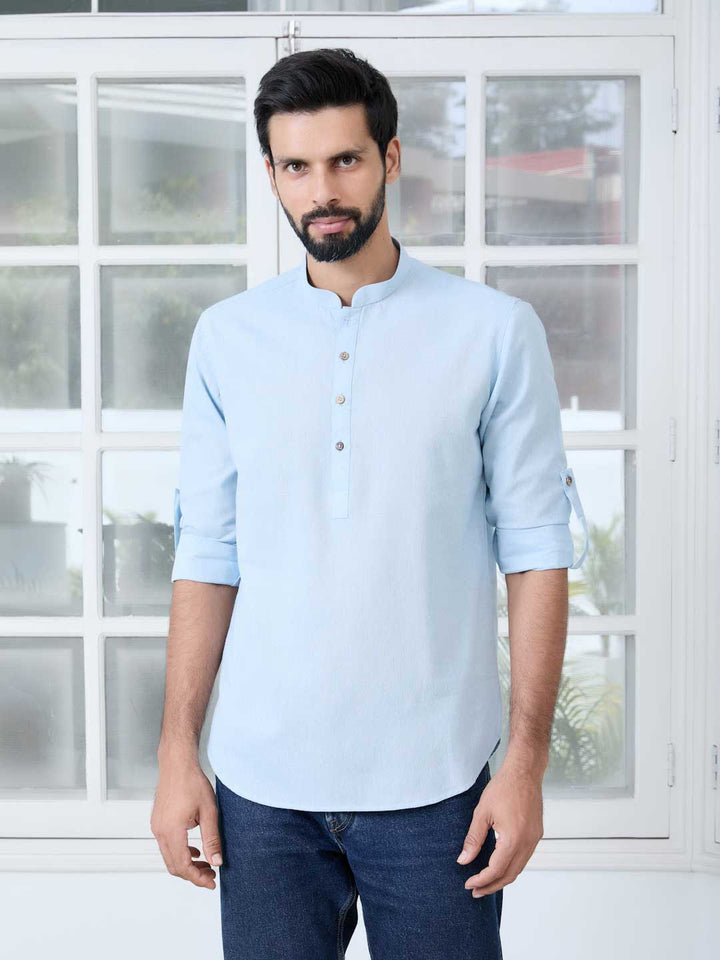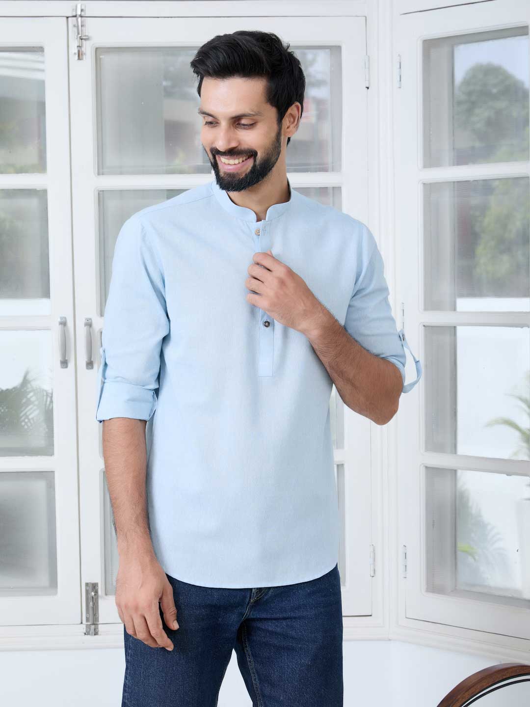 Description Cotton Short Kurta features a mandarin collar, long sleeves, a Curved hem, and side slits for added comfort and style.