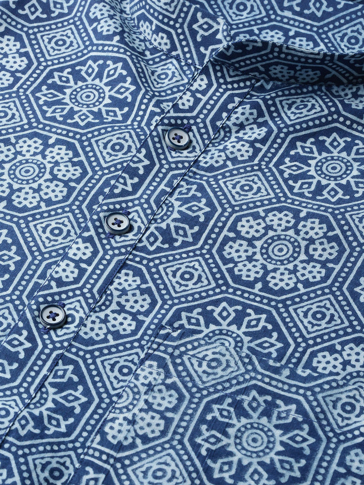 Men Indigo Blue Hand Block Floral Printed straight kurta with Pyjama