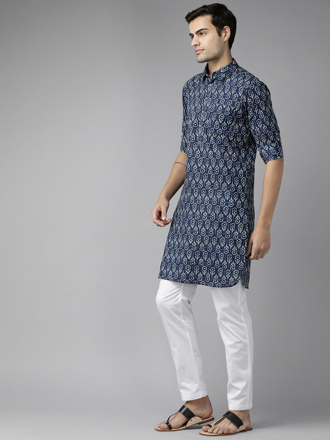 Men Indigo Floral Printed Pure Cotton Pathani kurta
