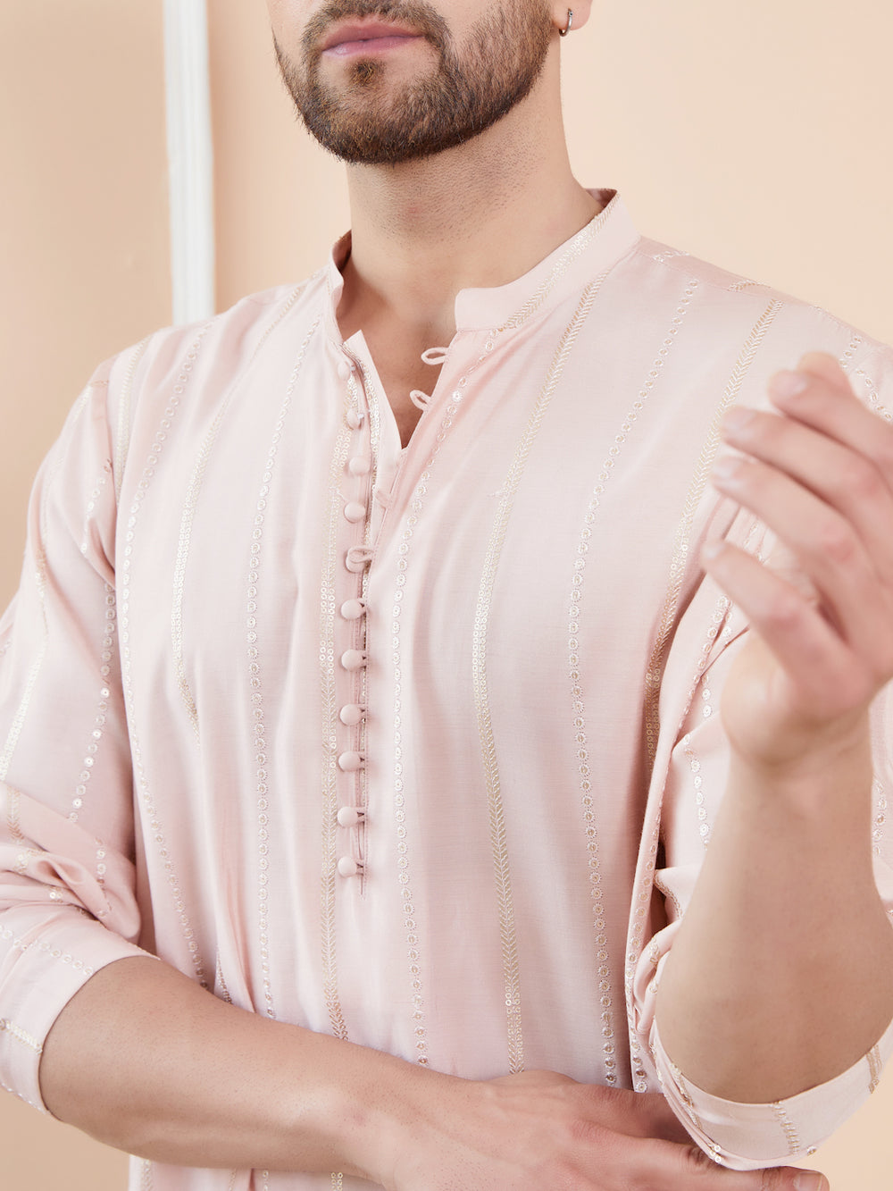 Men Pink and Gold Sequins Embroidered Chanderi Silk Straight Kurta With Pyjama