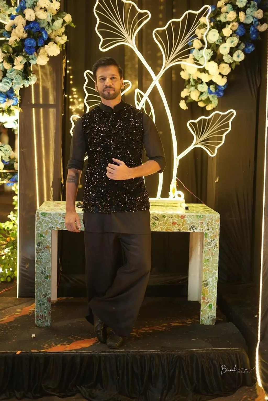 Style Tip: For a striking monochromatic look, pair this set with black leather mojaris. To add a festive pop, layer it with a contrasting maroon or gold Nehru jacket.
