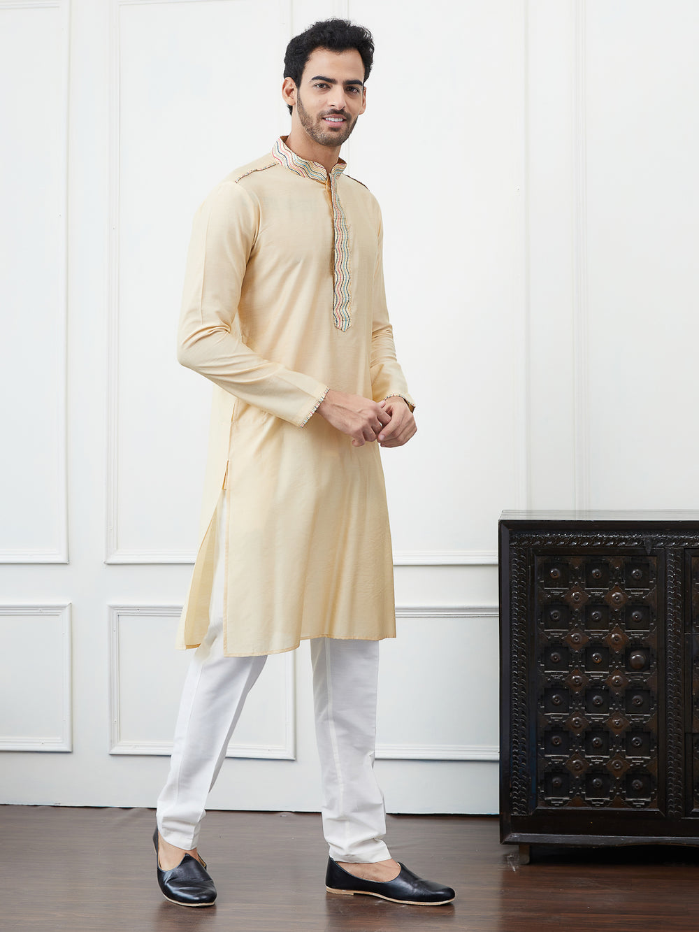 Beige Delux Cotton Straight Kurta with Embordered Neck