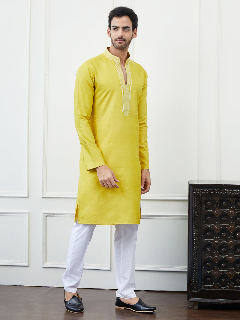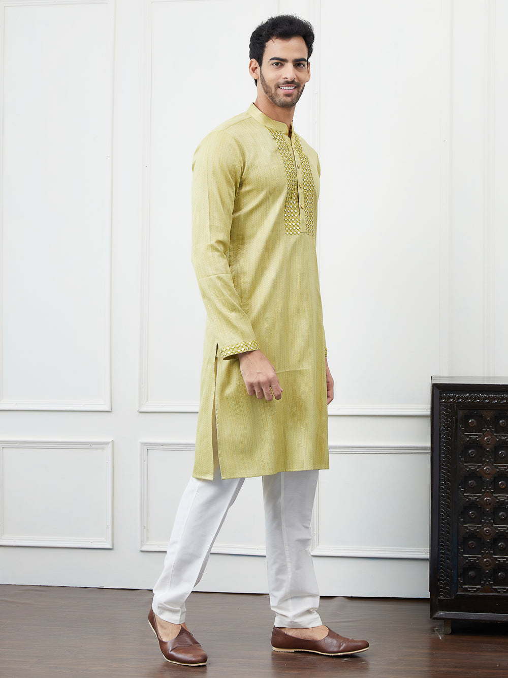 Lemon Green Delux Cotton Straight Kurta with Embordered Neck