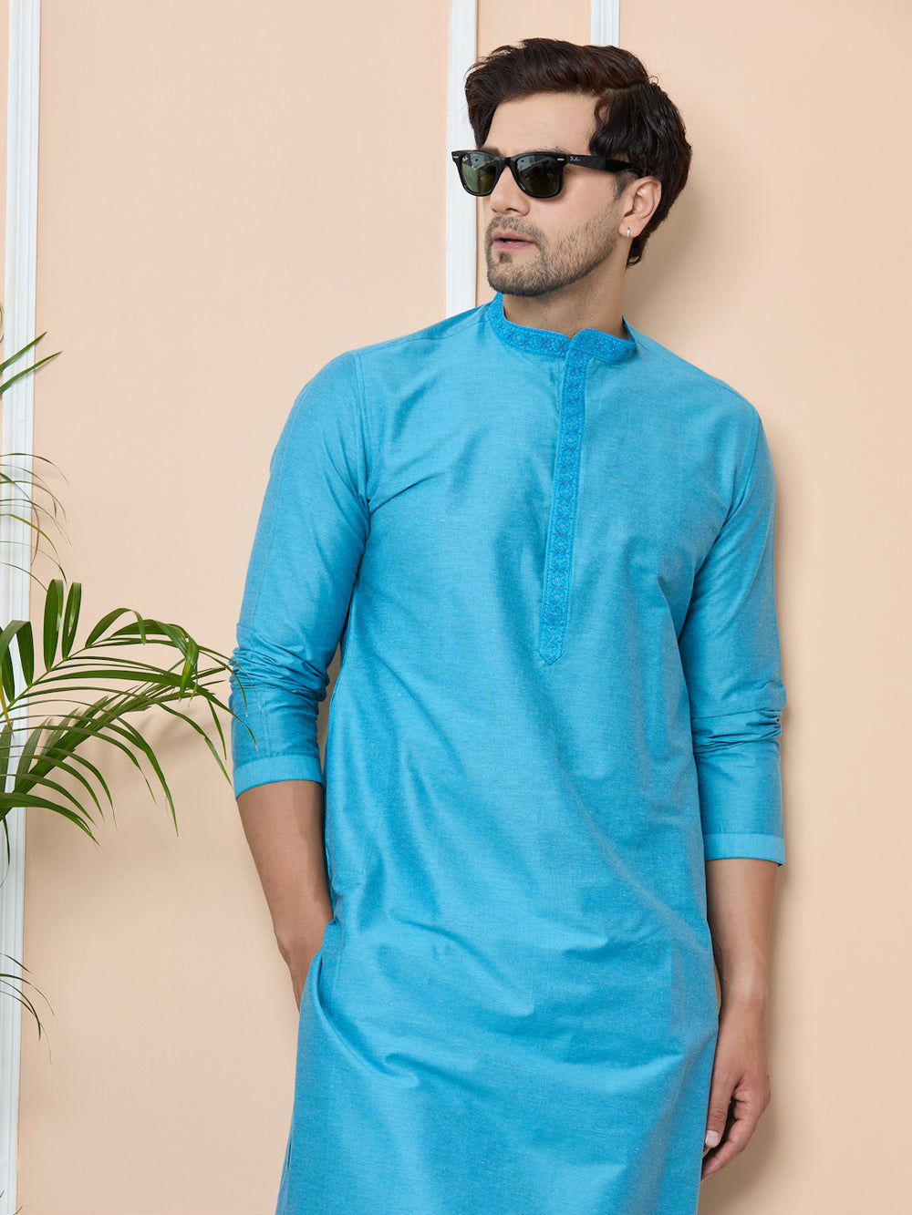 Turquoise Delux Cotton Straight Kurta with Embordered Neck