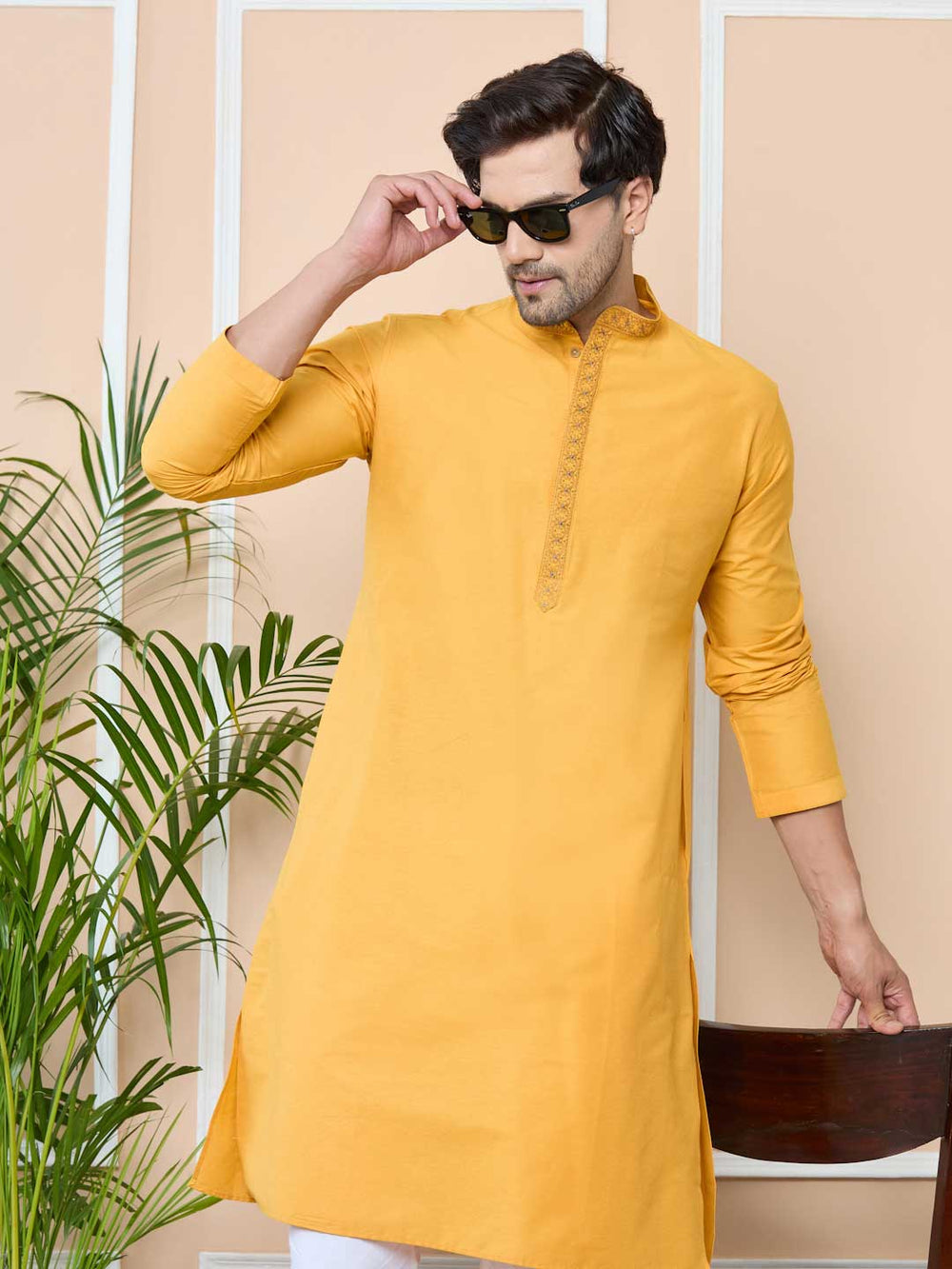 Mustard Delux Cotton Straight Kurta with Embordered Neck