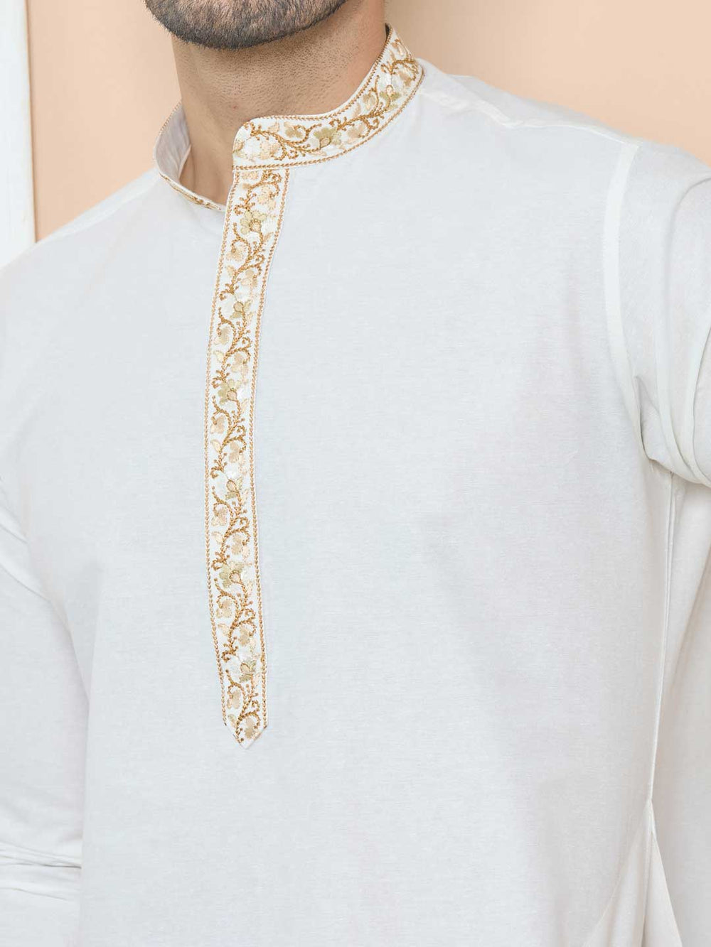 Off-white Delux Cotton Straight Kurta with Embordered Neck