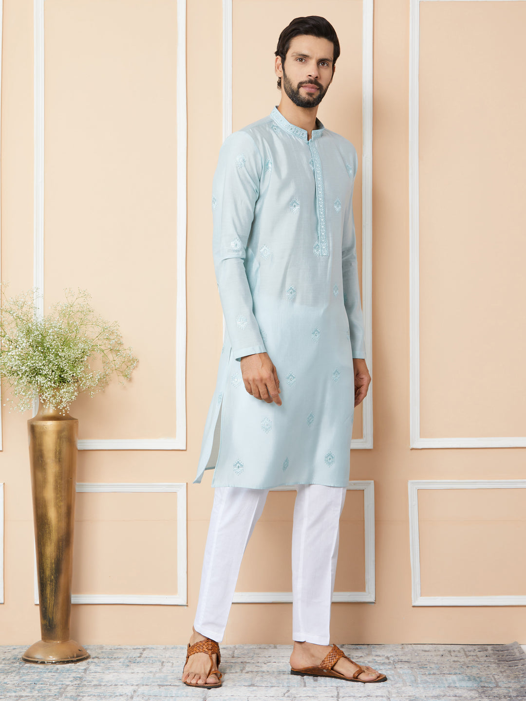 Introducing our Embroidered Pure Chanderi Silk Straight Kurta Paired Pyjama, featuring a stylish Mandarin collar, a sleek straight hemline, and side slits