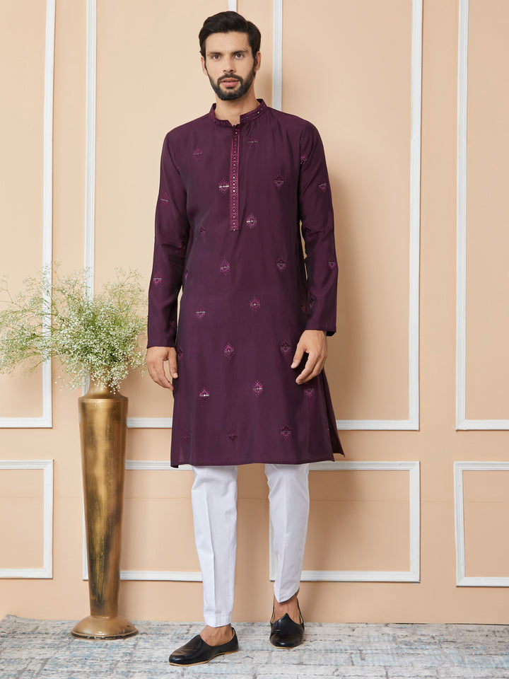 Introducing our Embroidered Pure Chanderi Silk Straight Kurta Paired Pyjama, featuring a stylish Mandarin collar, a sleek straight hemline, and side slits