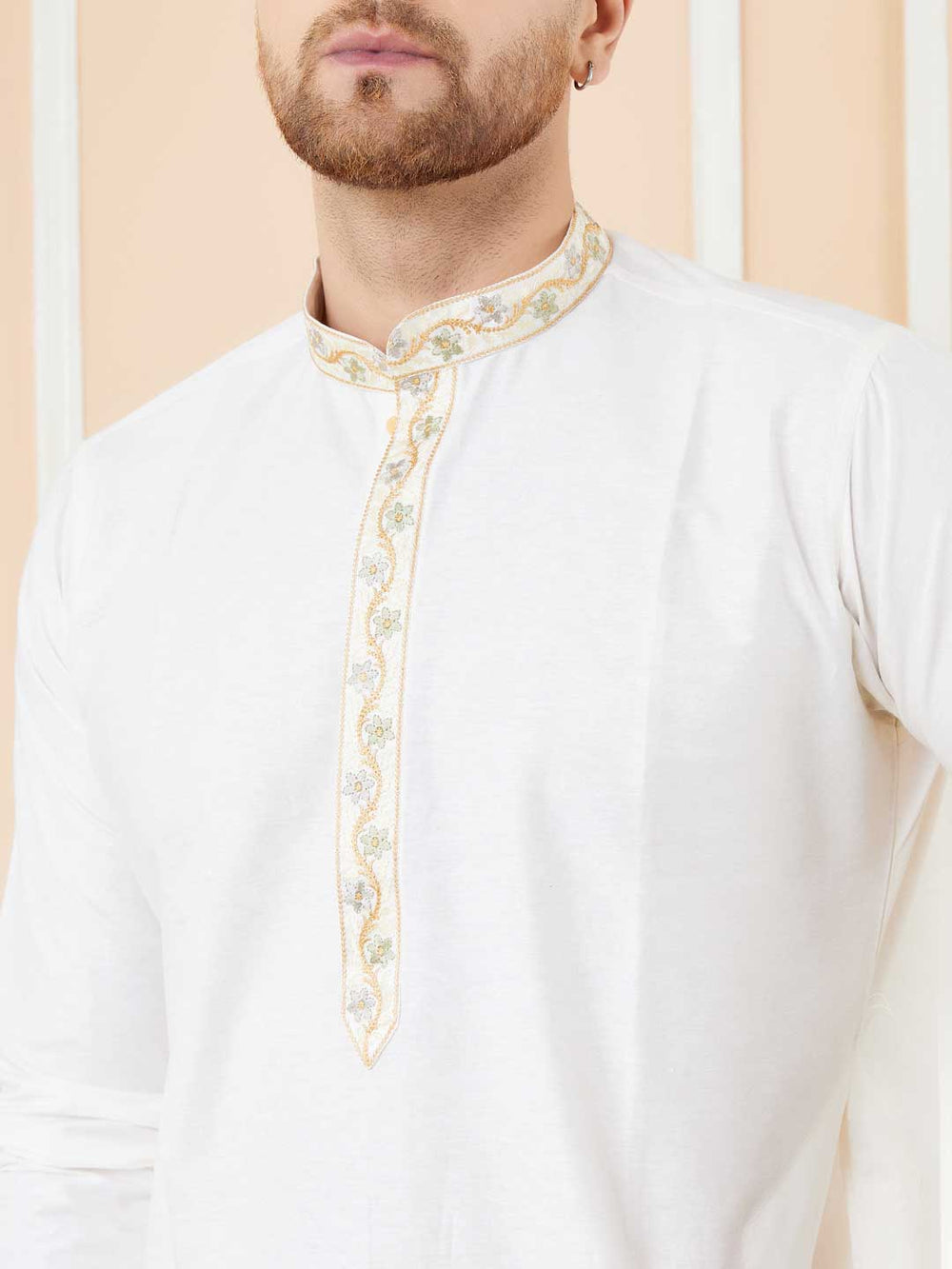 Cream Solid Cotton Straight Kurta with Emboridered neckline