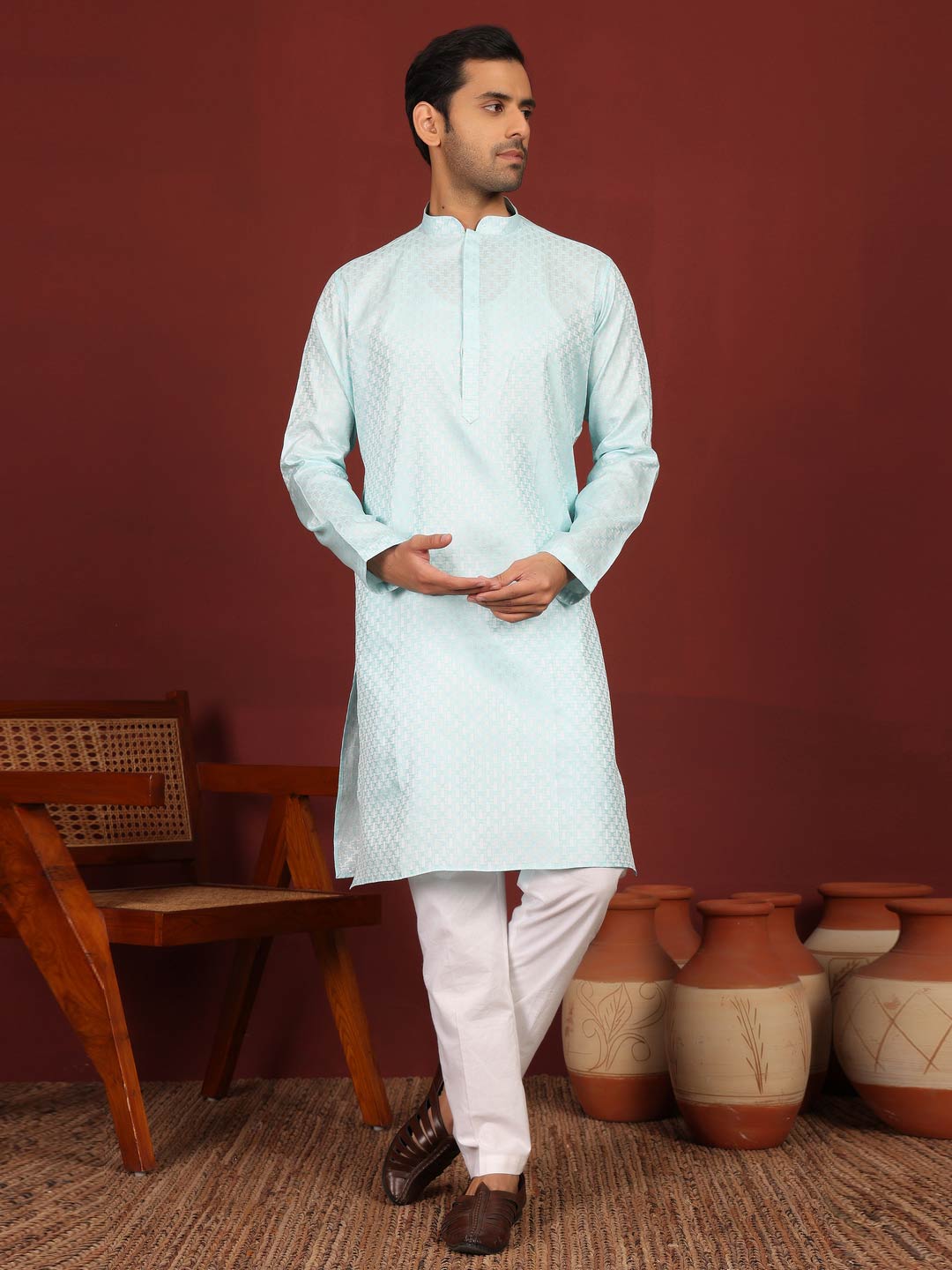 Aqua Green-Silver Woven Jacquard Art Silk Straight Kurta