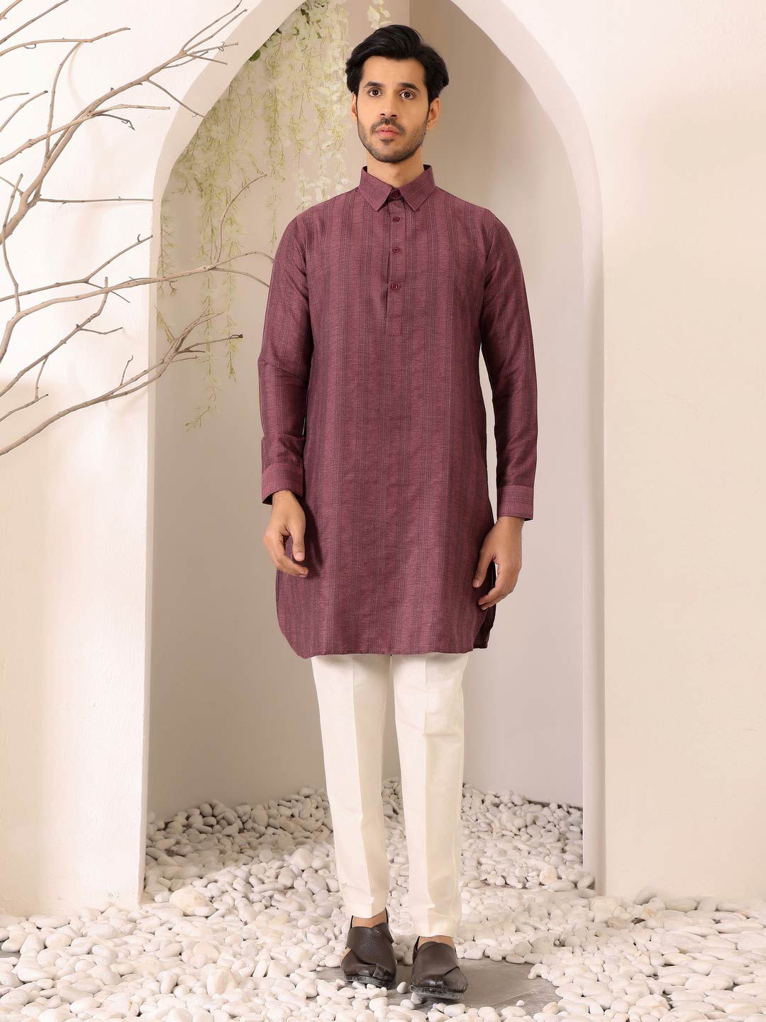 Dark Mauve Self Design Handwoven Cotton Pathani Kurta