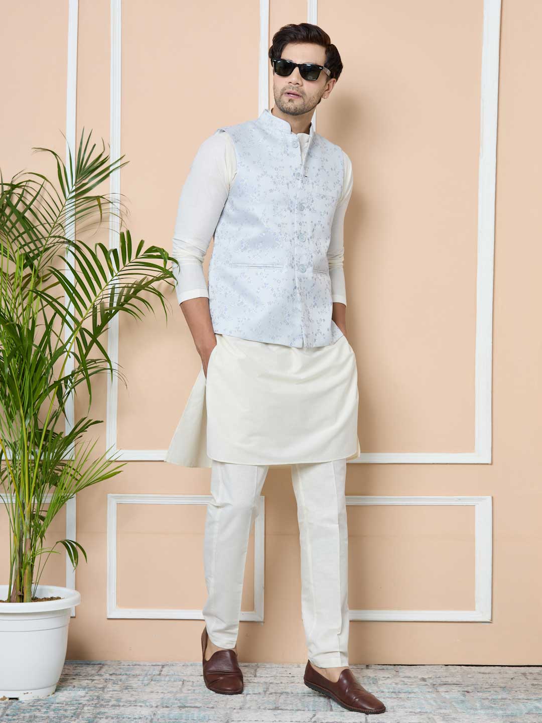 Introducing our Woven Jacquard Nehru Jacket featuring a mandarin collar, full button placket, and sleeveless design. Includes four functional pockets for added convenience. |