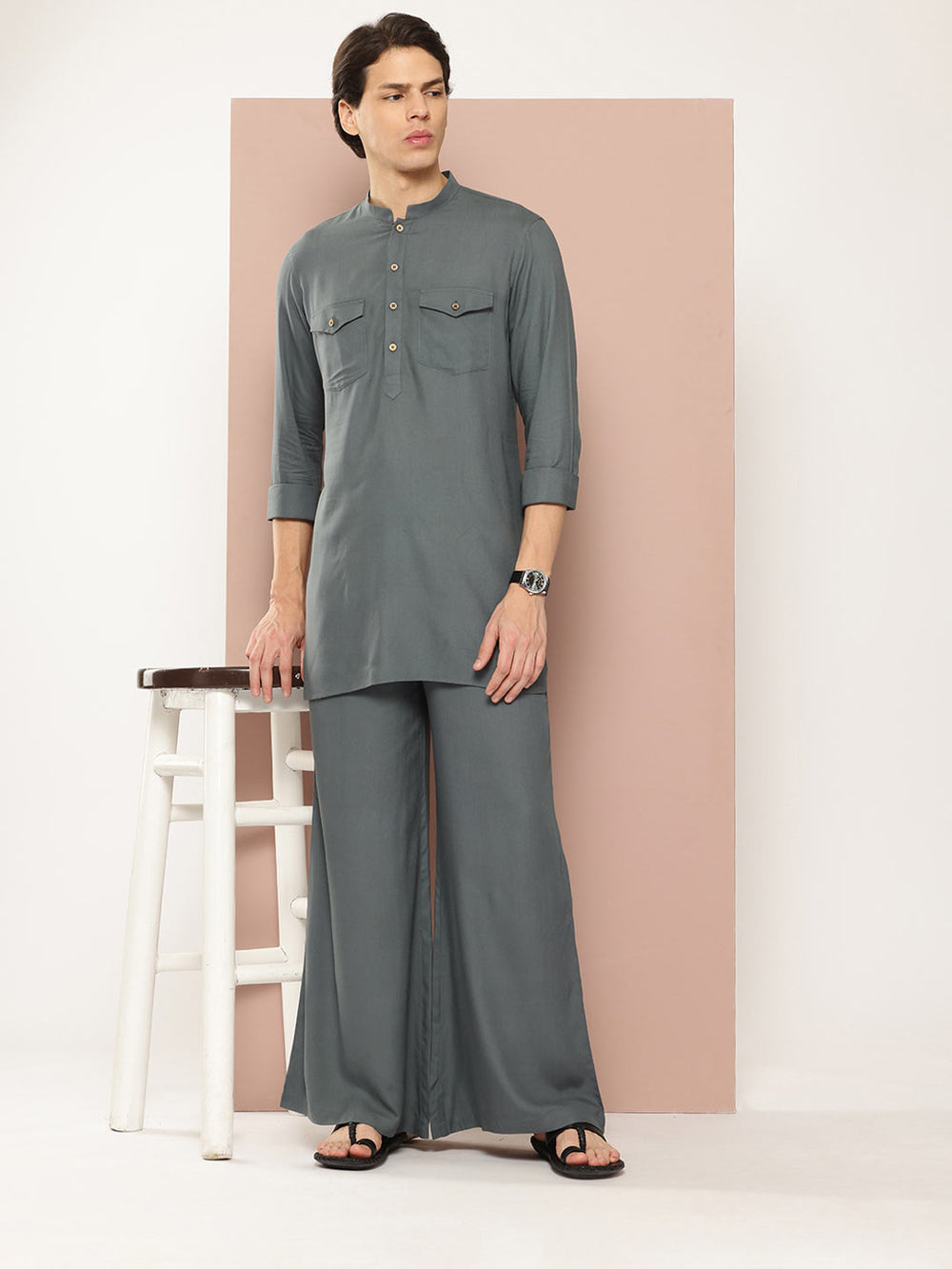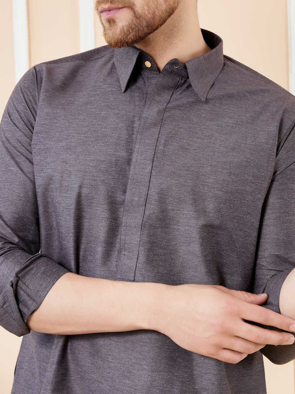 Men's Gray Linen Solid Pathani Co-ord Set