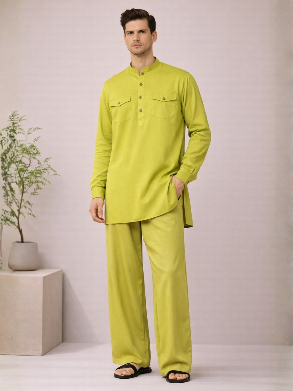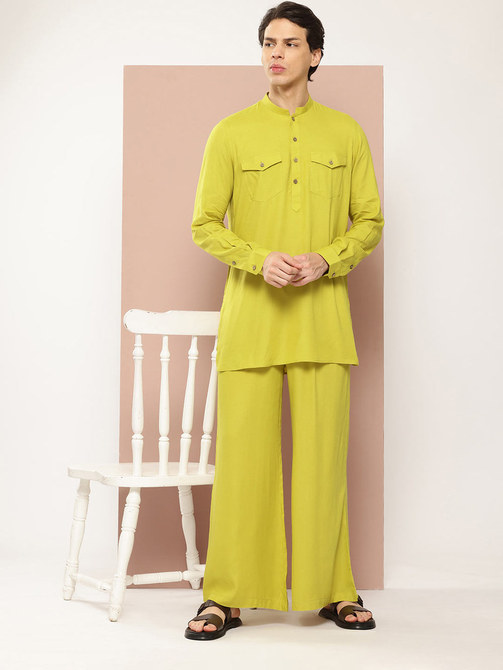 Men's Lime Green Rayon Solid Pathani Set