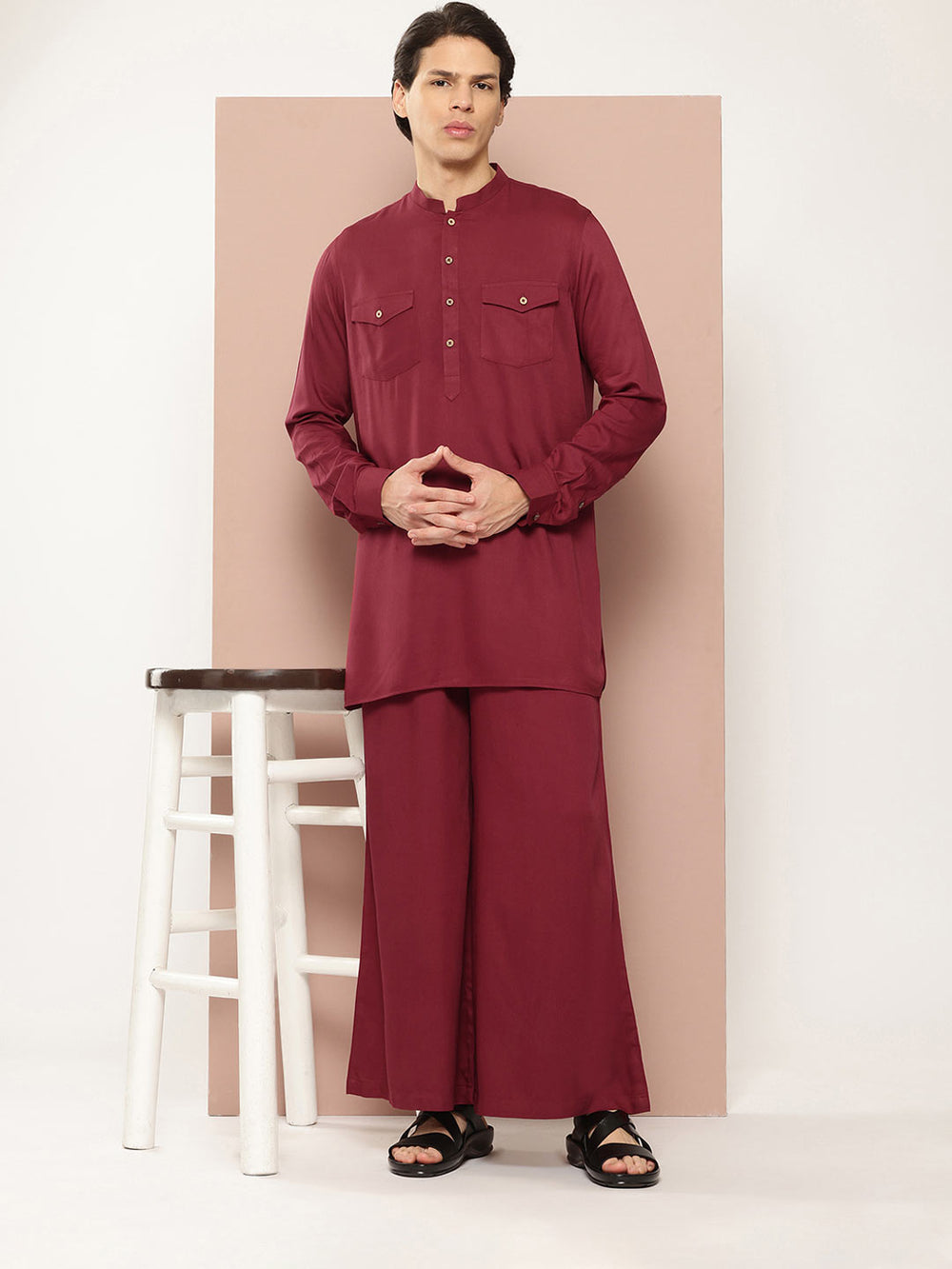 Men's Maroon Linen Solid Pathani Co-ord Set
