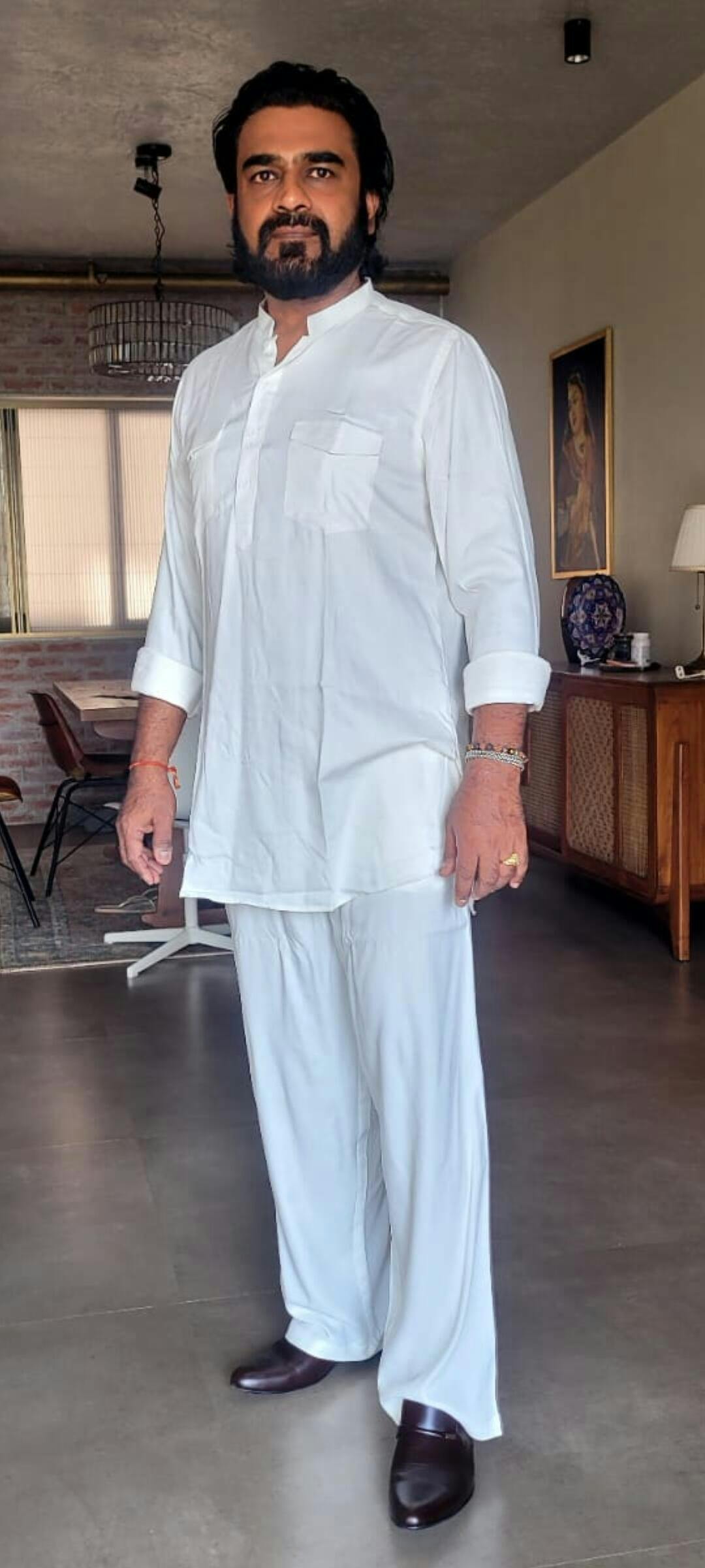 | Description | Men's Rayon Solid Pathani Set featuring a mandarin collar, long sleeves, curved hem, concealed button placket, two chest pockets, and a wide-leg pyjama. |