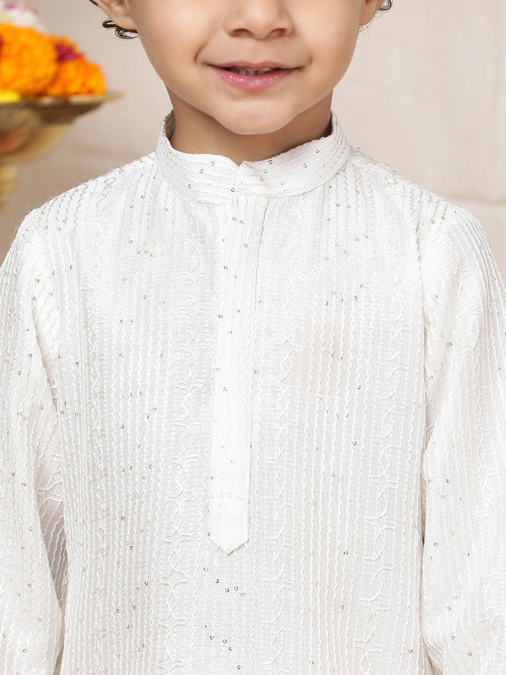 Boy's Off-White Sequinned Embroidered and Thread Work Chanderi Silk Straight Kurta with Pyjama