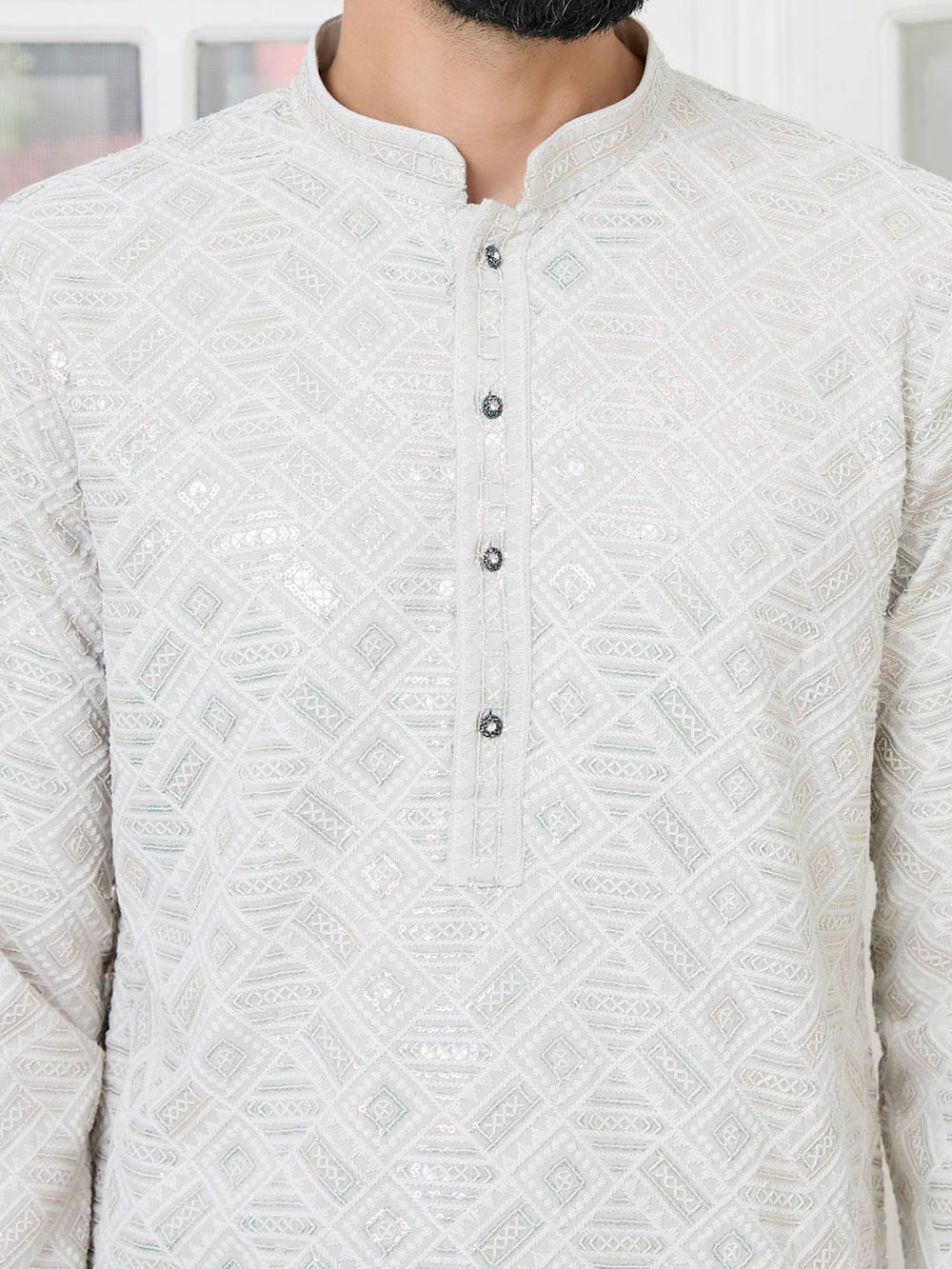 | Description | Geometric Sequins Embroidered Thread Work Straight Kurta, features a mandarin collar, long sleeves, two side pockets, a straight hem, and side slits for added comfort and style. |