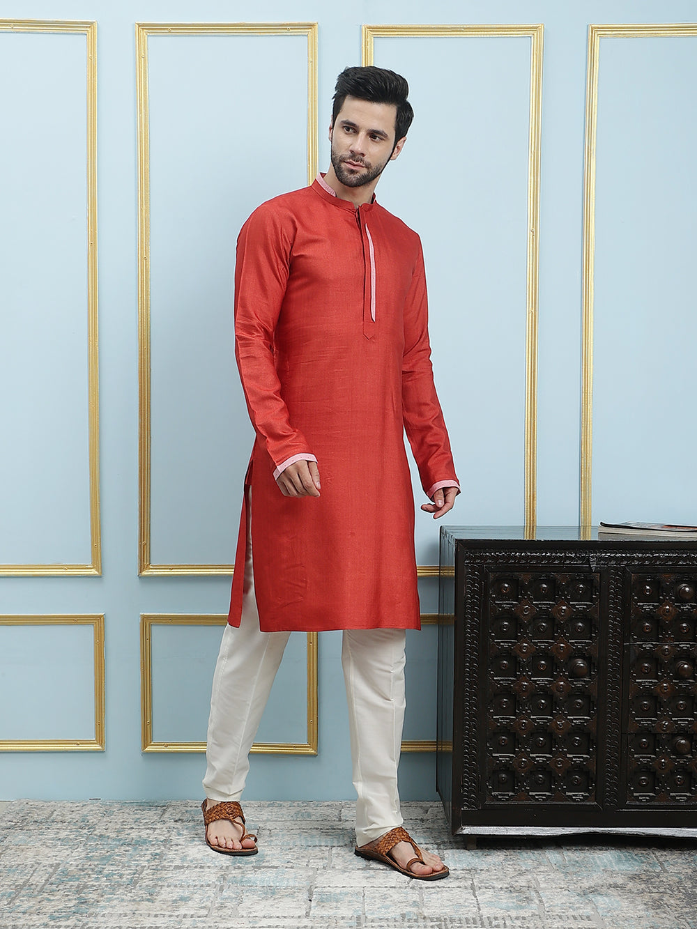 | Description | Solid Cotton Silk Straight Kurta, featuring a stylish Mandarin collar, a sleek straight hemline, 2 Side Pockets and side slits |