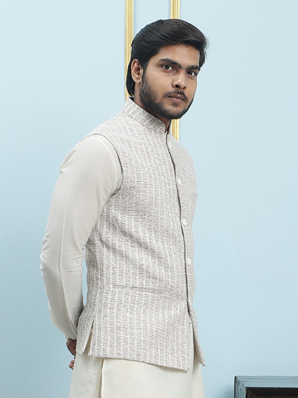 | Description | Solid Handwoven Pure Cotton Nehru Jacket, featuring a stylish Mandarin collar, three front pockets, one interior pocket, and a sleek straight hemline. |