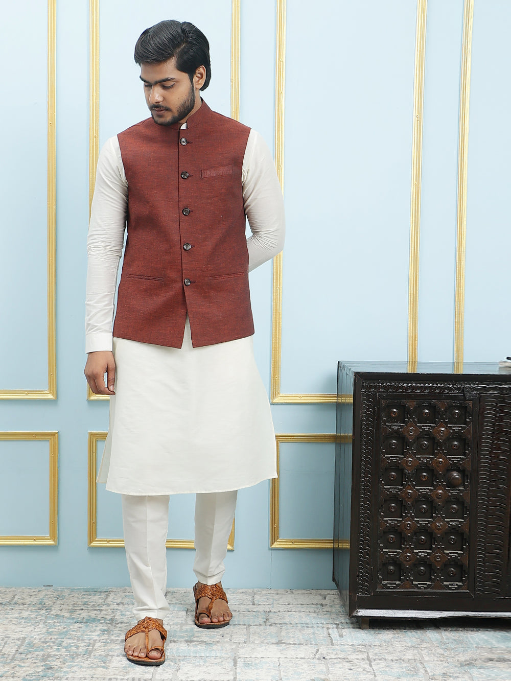 | Description | Solid Woven Silk Nehru Jacket, featuring a stylish Mandarin collar, three front pockets, one interior pocket, and a sleek straight hemline. |