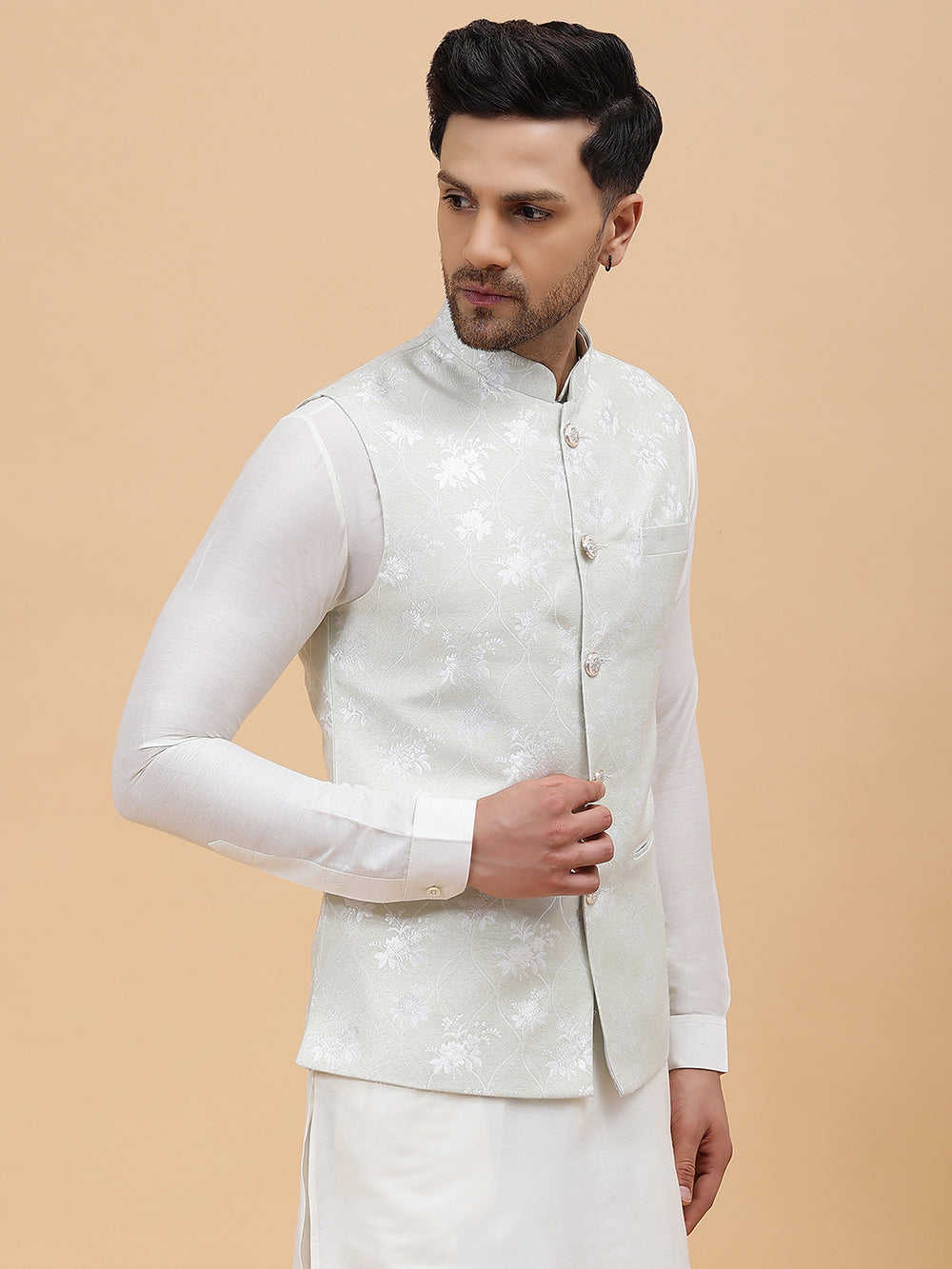 | Description | Woven Jacquard Nehru Jacket, has a mandarin collar, A full button placket, 3 Pockets, straight hem, Woven Design |